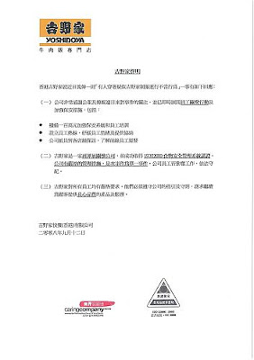 吉野家在聲明中強調,該公司是一家「商界展關懷」公司,並有嚴格的管理措施,吉野家指是次事件為單一事件,公司員工皆勤奮工作,依法守紀;該公司對所有員工均有嚴格要求,要求所有員工必須遵守公司的指引及守則,務求繼續為顧客提供良心品質的產品及服務。